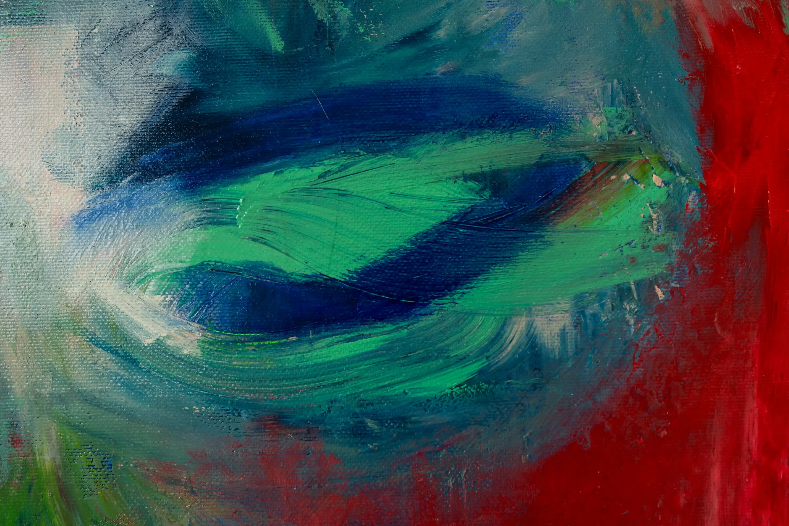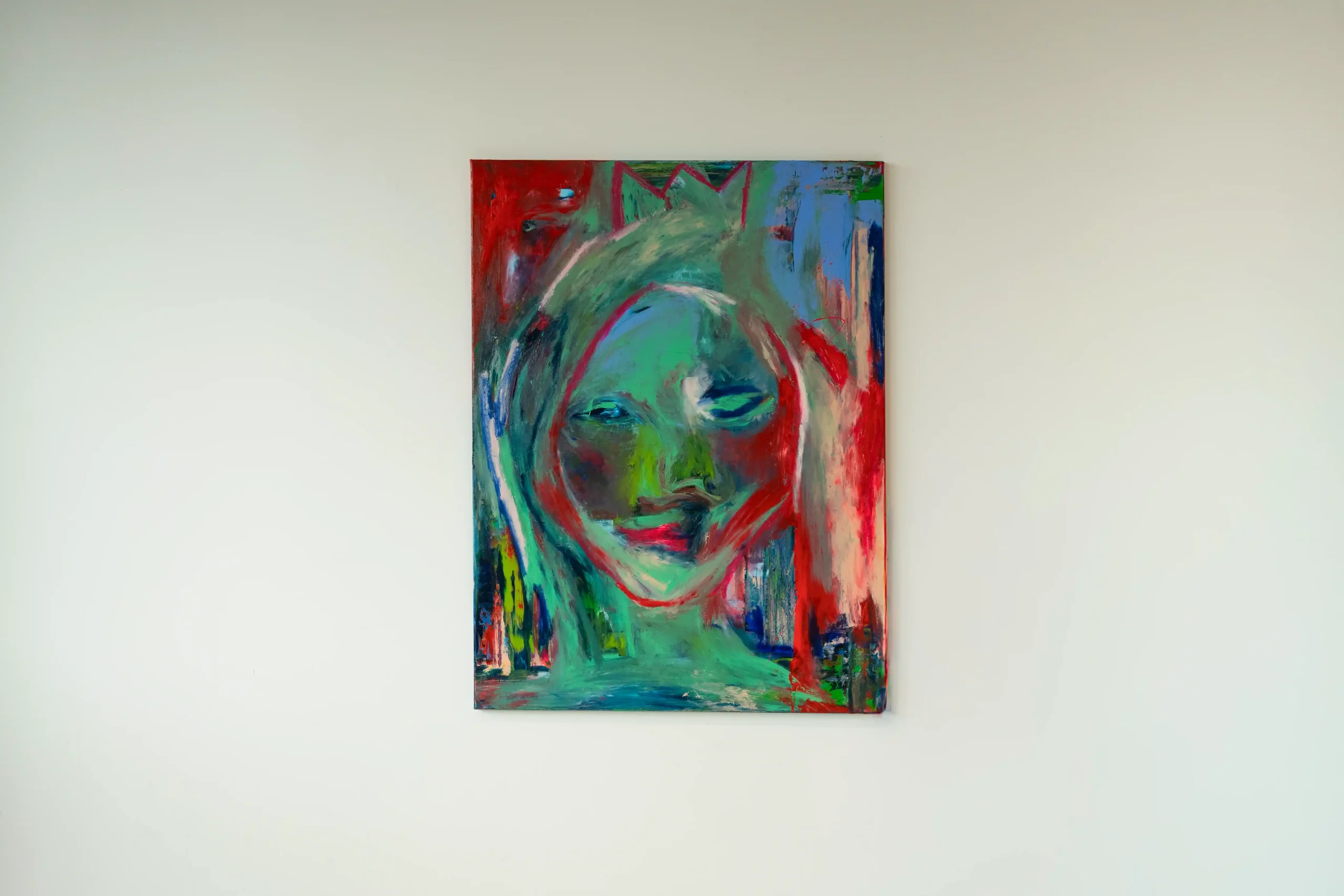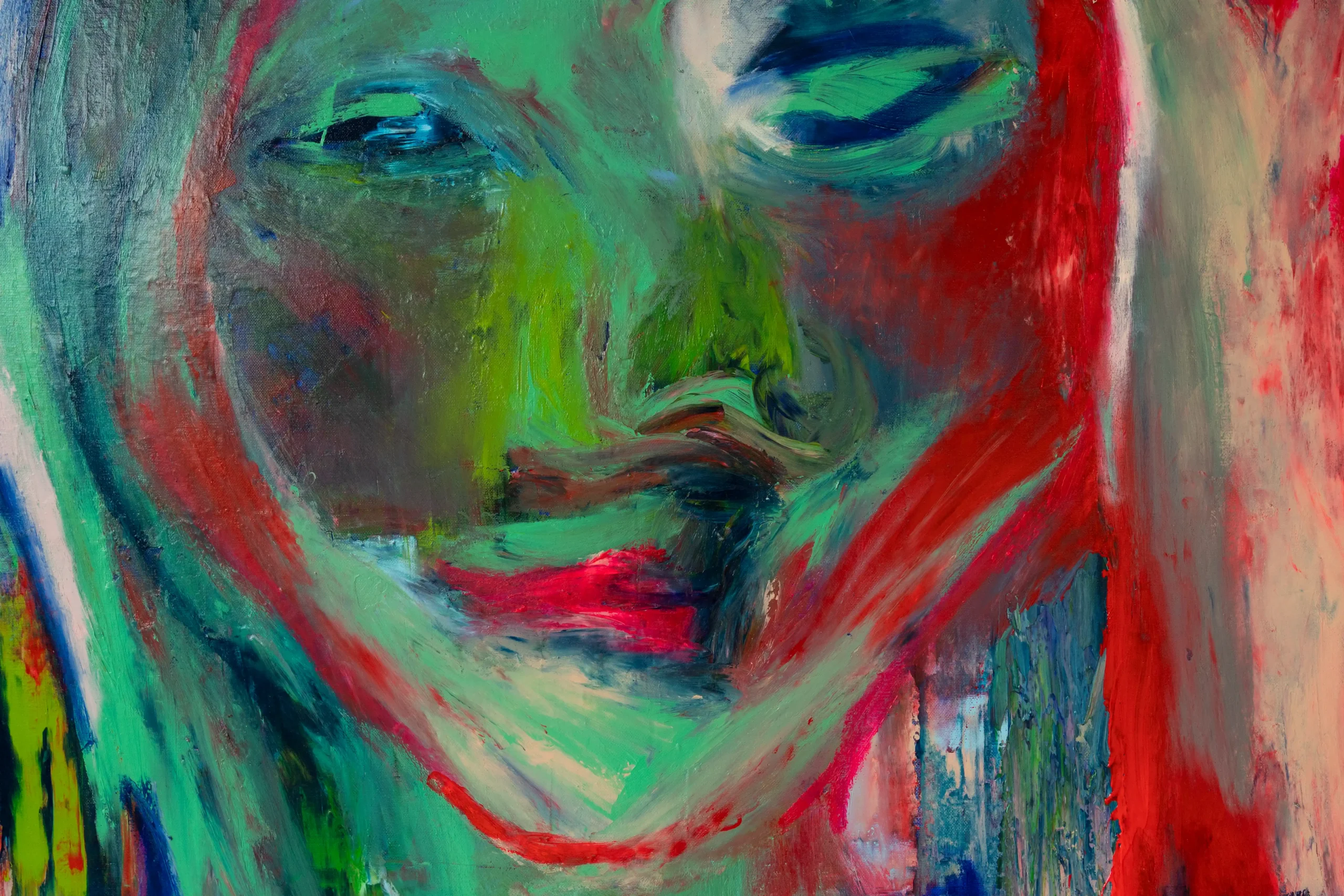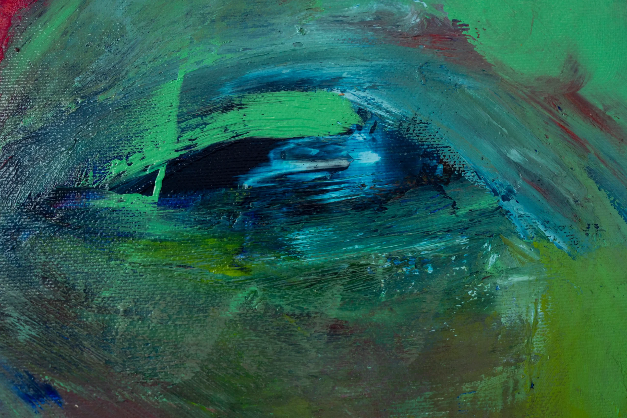 Lost in the Game of Becoming is an expressive selfportrait that captures the tension between who we are and who we want to be. By letting go of perfection, and using green, red, and blue layered against a raw background, this abstract artwork reflects both struggle and transformation. There the face emerges and dissolves at once. It is a reminder that identity is fluid, never fixed.